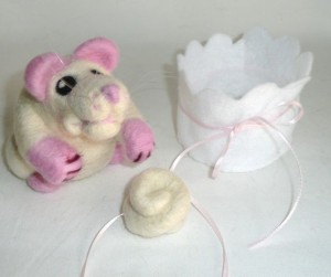 No offense to the original hammy but I felt that his costume would have been a little more fun if he had a blob of cream as a hat so I made him a detachable one that he can tie on, should he choose to, his cupcake I hand sewed from felt.
